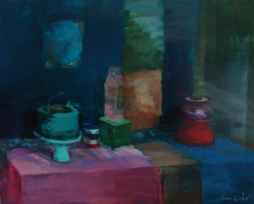Martwa natura z turkusowym czajnikiem:, akryl na półtnie, 110x90cm
