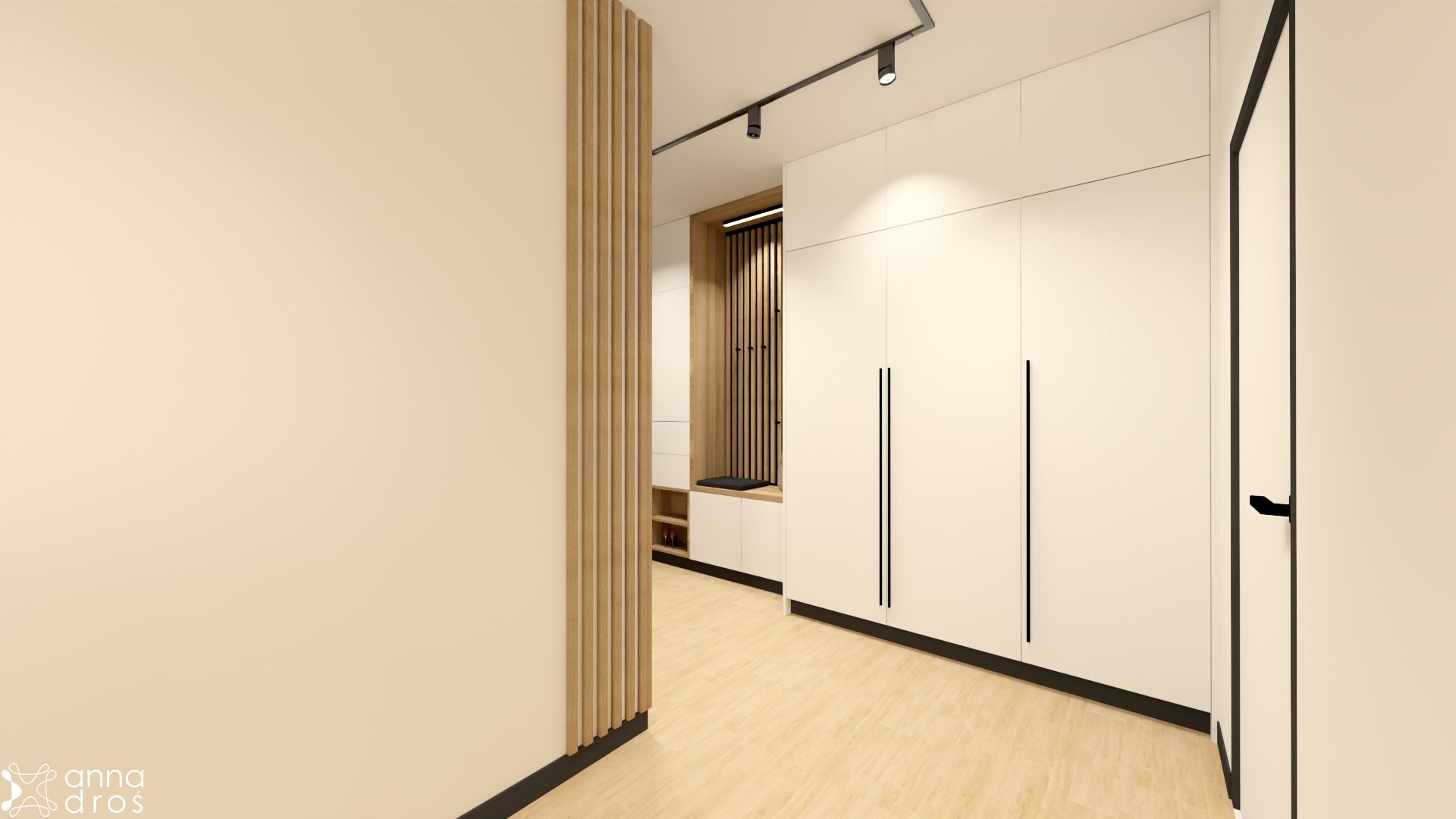 Projekt wnętrz dla młodego małżeństwa. Właściciele mieszkania to osoby aktywne zawodowo, którym zależało na stworzeniu przytulnych i wygodnych wnętrz z dużą ilością miejsca do przechowywania.