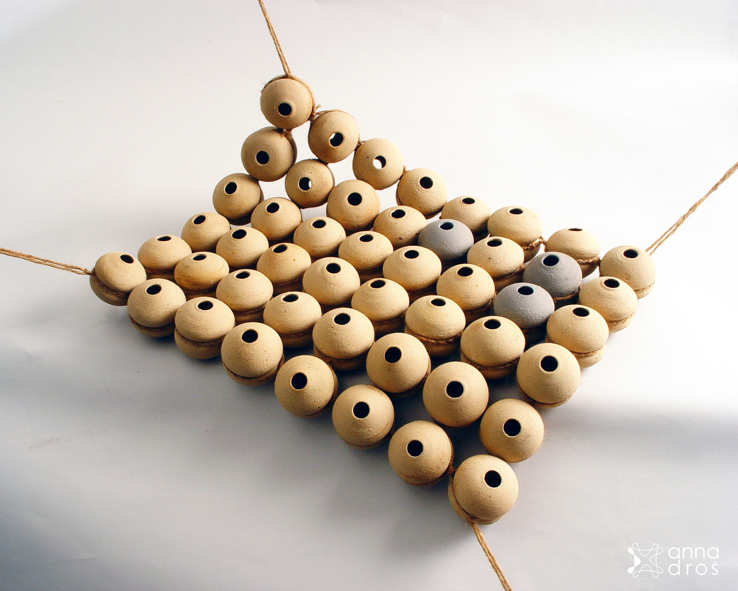 „Multiplikacja” kompozycja z elementów toczonych na kole garncarskim, połączonych sznurkiem. Wymiary: 54x40x7cm