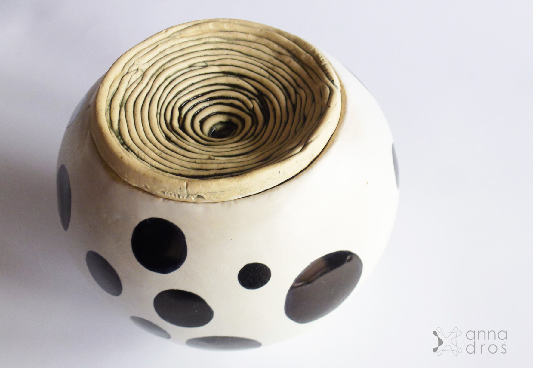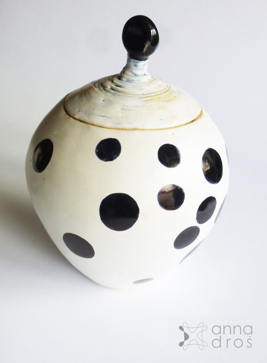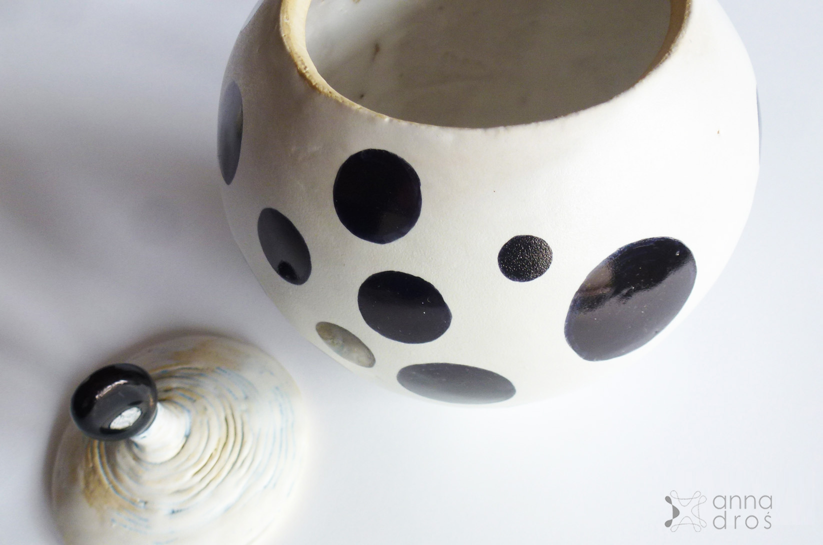 Pojemnik w grochy- lepiony ręcznie, techniką tzw. z wałeczków. Wys. z pokrywką 21cm.